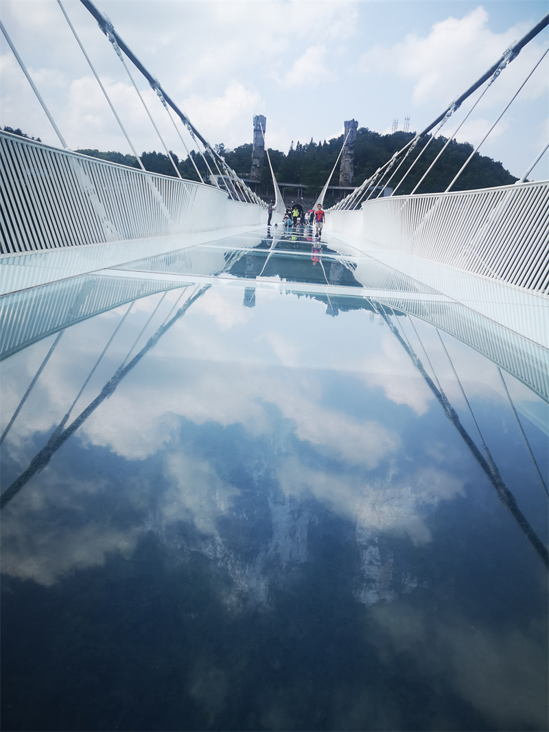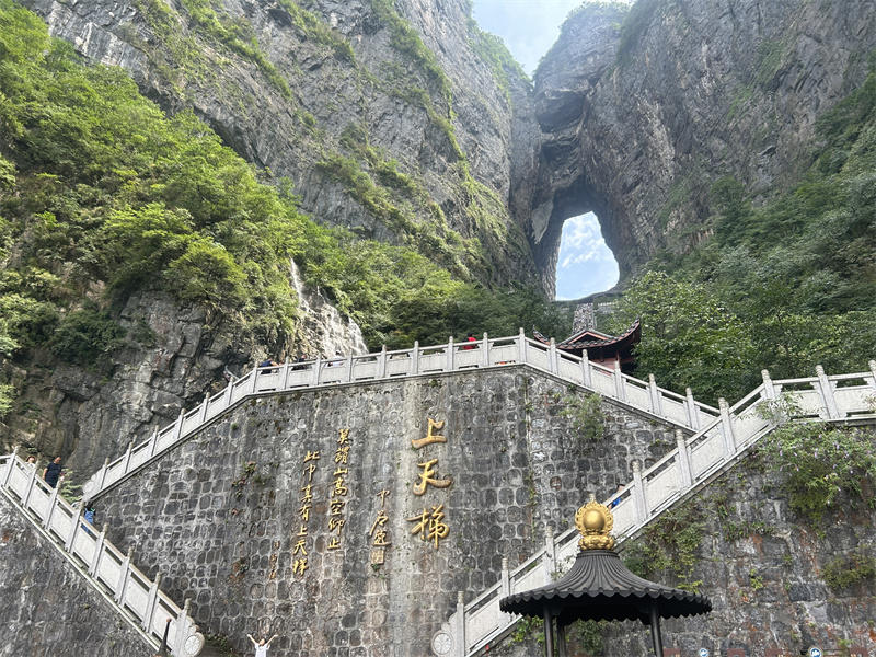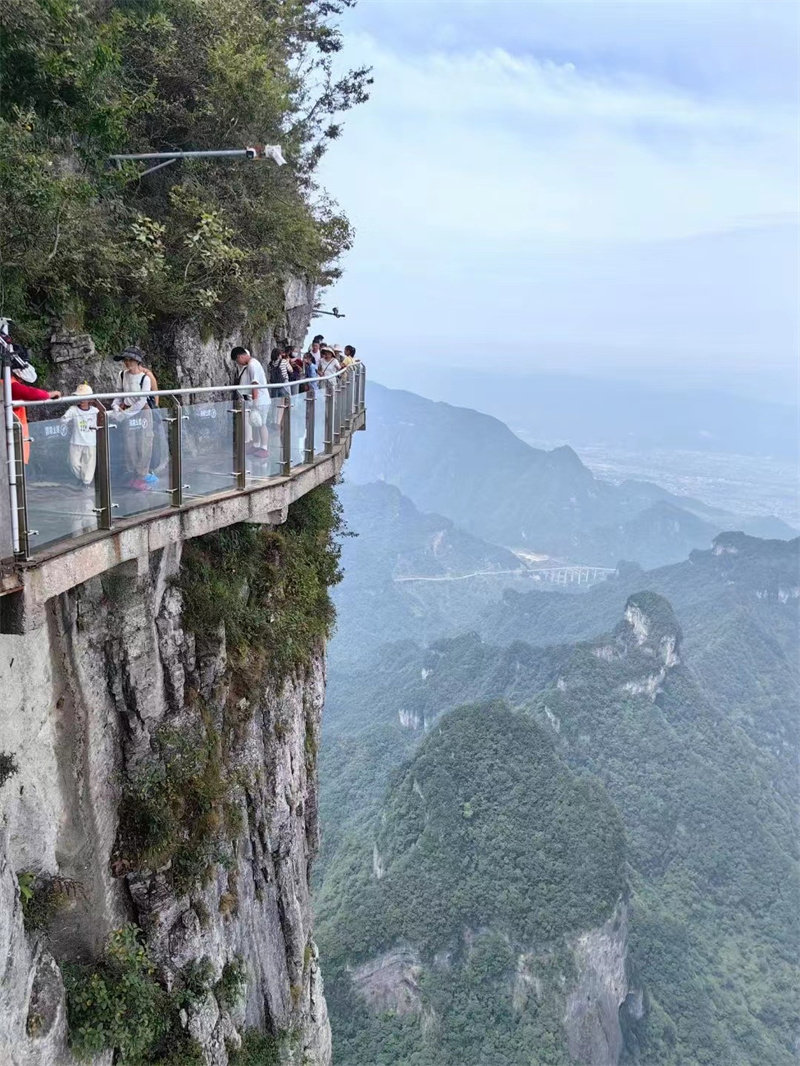 随后,一同前往【天门山】景区。乘坐最长的缆车上山,让你感受城市到山野的穿越,透过缆车窗户,看天门山,缆车前进,山景也跟着前进,奇峰异石映入眼帘,甚是震撼。走鬼谷栈道,登张家界之巅云梦仙顶,俯瞰张家界全景。走过惊险刺激悬空【玻璃栈道】,挑战高空极限,被美景吸引,不禁来上2张美照。接着,乘坐穿山扶梯,再下山游览天门洞,走过999级台阶,到达天门洞广场。遥看山下蜿蜒的公路,同事们欢快的嬉戏声毫不吝啬地回应着美好的景色。历史文化积淀深厚的天门山,一直被当地人民奉为神山,圣山,更被誉为“湘西第一神山”和“武陵之魂” 的美誉。