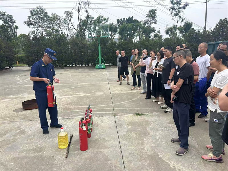 在实操环节,企业安全负责人、园区安保队员纷纷参与灭火模拟演练,按照 “一提二拔三握四压” 操作规范完成实战操作,彭州消防队江参谋现场纠正动作偏差,确保全员掌握初期火灾扑救技能。