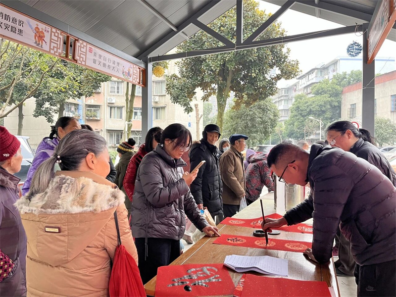 1月25日,腊八节前夕的三四八小区广场游廊内,新春集市区一早便排起了长队。鑫和书画院的老师现场挥毫泼墨,笔尖流转间,一幅幅笔力遒劲的春联、一个个寓意吉祥的 “福” 字跃然纸上。鑫和的党员志愿队的同志们也活跃期间,到场居民们或静心等候,或与党员志愿者、书法老师沟通定制专属内容,“龙年纳福平安喜乐”“邻里和睦万事顺意” 等吉祥话语,既承载着大家对新年的期盼,也让传统文化在笔墨香中代代相传。拿到亲手定制的春联,老人们笑得合不拢嘴,孩子们兴奋地举着 “福” 字四处展示,墨香与欢笑交织成最动人的节日图景。