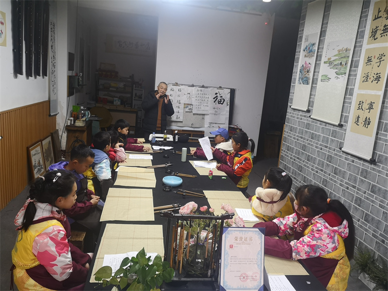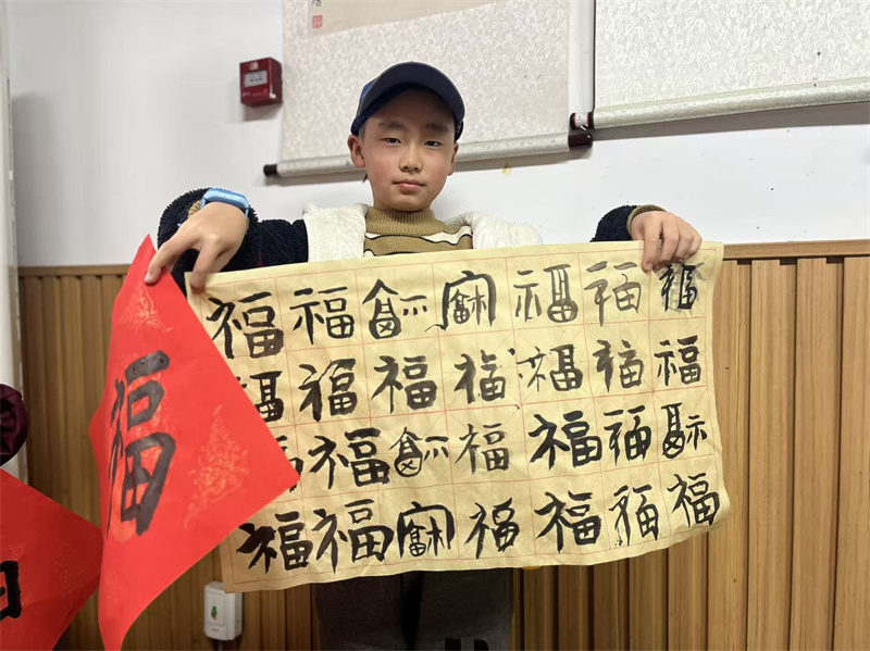 2月7日上午,"承古韵风华·育少年志气"成长营的开班仪式在鑫和书画艺术馆拉开帷幕。鑫和书画院刘道德老师为孩子们带来沉浸式的书法教学。鑫和党员志愿者也到场开展公益服务。课堂上,刘老师细致讲解 “福” 字的寓意及 “五福” 的由来,让孩子们知其然,知其所以然;随后,刘老师从握笔姿势、运笔技巧等基础要点入手,手把手指导孩子们书写新春 “福” 字。孩子们凝神静气、一笔一划认真临摹,在宣纸间勾勒出一个个稚嫩却饱含心意的 “福” 字,在感受中华汉字韵律之美的同时,将对新年的美好祝福融入笔墨之中。书写完毕后,孩子们小心翼翼地将作品平铺晾干,红纸上的笔墨渐渐凝实,也将这份专属的新春暖意定格。活动最后,孩子们手捧自己亲手书写的 “福” 字,脸上洋溢着满满的成就感与幸福感,以字寄情、以福表意,为即将到来的丙午马年添上了浓墨重彩的一笔。