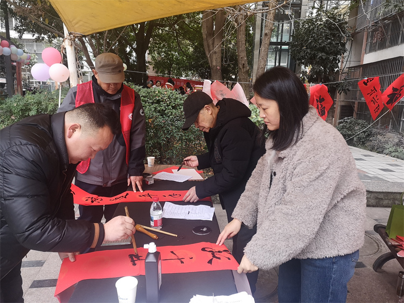 2月1日和2月7日下午,锦绣西苑二期及锦绣西苑一期新春游园会现场,鑫和书画院老师们及鑫和书画艺术馆的书法志愿者们共同挥毫泼墨,用春联和福字寄托对新春的美好祝愿。期间,既有鑫和书画院专业书法老师们或苍劲有力、或洒脱飘逸的挥毫,一个个端庄大气的“福”字、一副副寓意吉祥的对联信手绘就;又有对传统书法感兴趣的小学员,主动分享技巧,从握笔的姿势、墨汁的浓淡,到笔画的起承转合,耐心地答疑解惑,鼓励大家积极参与,提笔尝试,蘸墨、落笔、运笔,在红纸上凝神挥毫,写出一幅幅姿态各异的新春作品。鑫和党员志愿者们在现场,不停地登记居民定制内容及要求、整理老师及居民们书写好的春联福字,或平铺 或悬挂,晾干分发。一时间,现场各得其乐,其乐融融,让大家深切感受到春节的浓厚氛围。